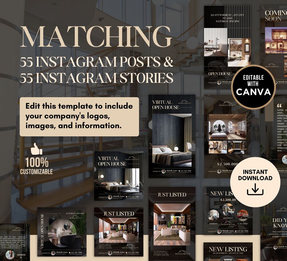 Introducing our 110 Luxury Instagram Templates, designed to elevate your real estate agent game on Instagram. With 55 meticulously crafted Instagram post templates and 55 accompanying Instagram Stories templates, this bundle has everything you need to create a visually stunning and professional-looking feed.