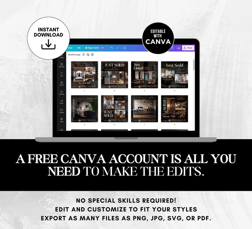 *Every image and graphic is accessible in Canva's FREE version. Your 110 Real Estate Agent Instagram Templates (Matching 55 Instagram Posts and Instagram Stories) will be available to use after the profile images, content details, photos and logos have been changed.