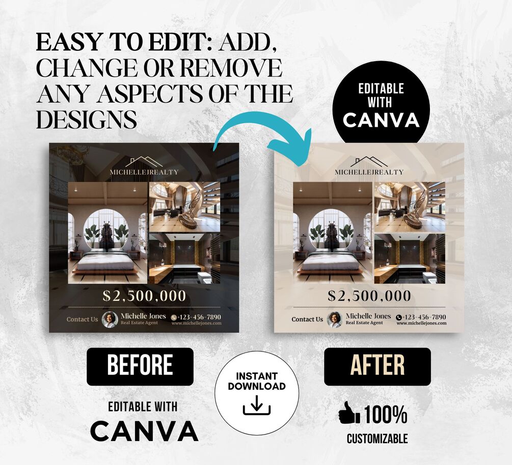 Save time and effort by using our pre-designed templates to create professional and consistent content that resonates with your target audience. Stand out from the competition and establish yourself as an authority in the real estate market with stunning visuals that tell a compelling story.