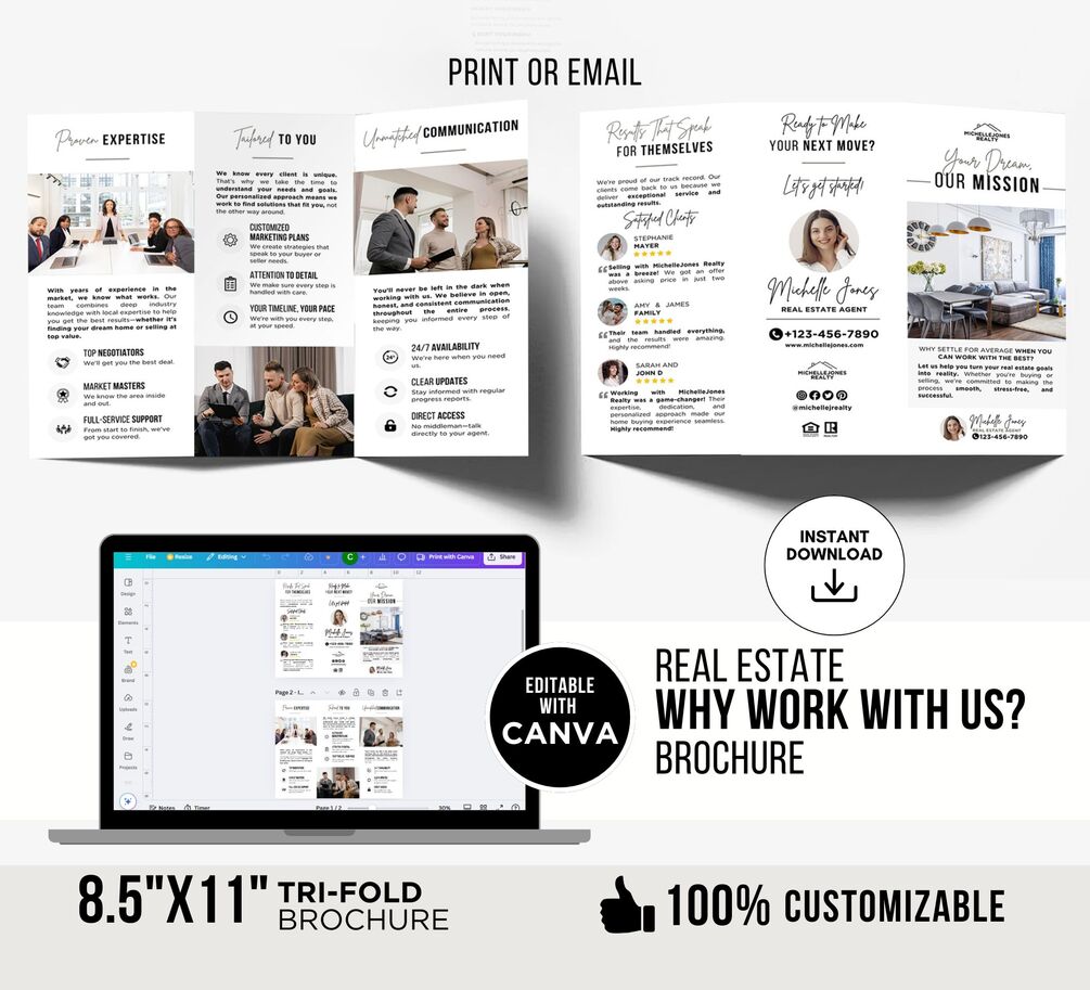 Lastly, the Why Work With Us Brochure highlights the unique advantages of partnering with your real estate agency, setting you apart from the competition. This bundle is not just a set of brochures; it's a toolkit to enhance your professional image, educate clients, and ultimately drive success in the competitive real estate market. Elevate your real estate business with this comprehensive Real Estate Brochure Bundle that speaks volumes about your expertise and commitment to excellence in every transaction.