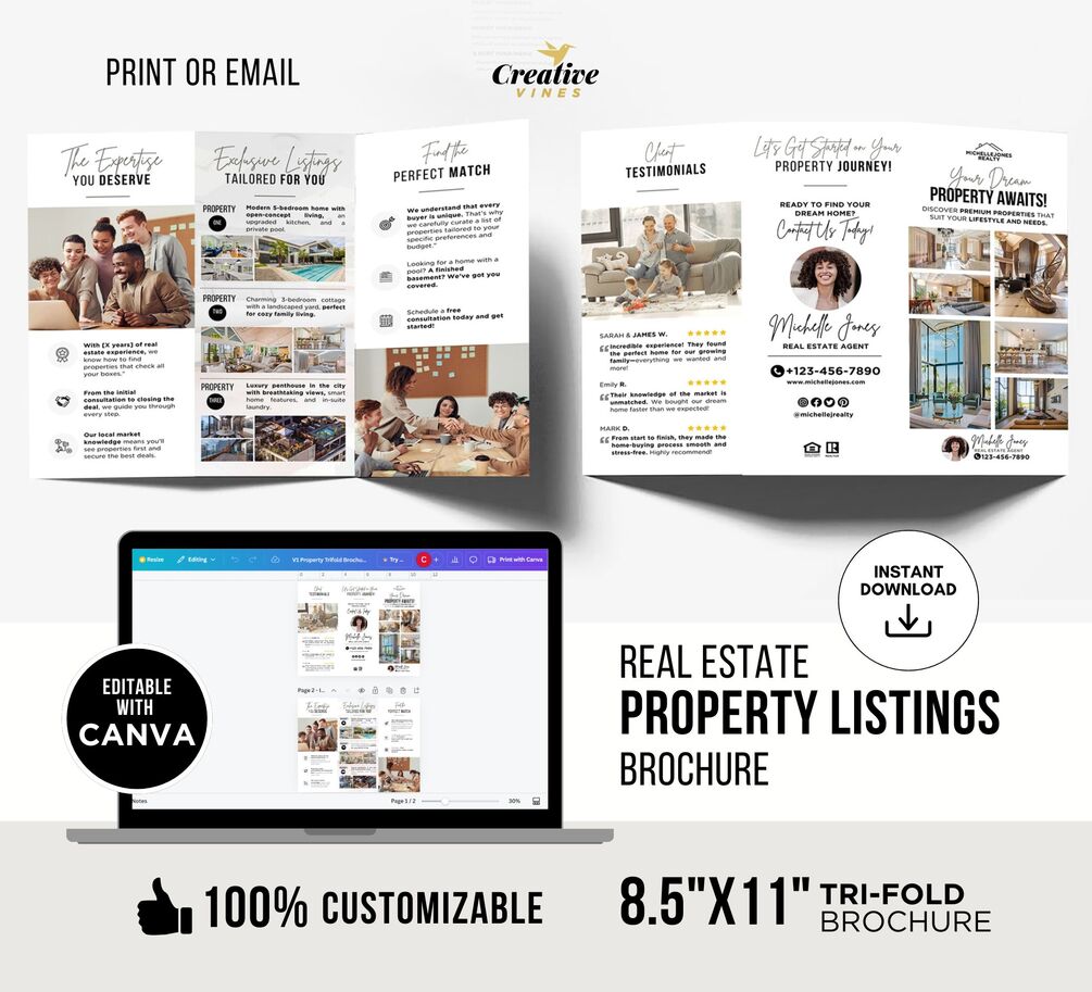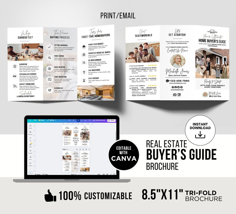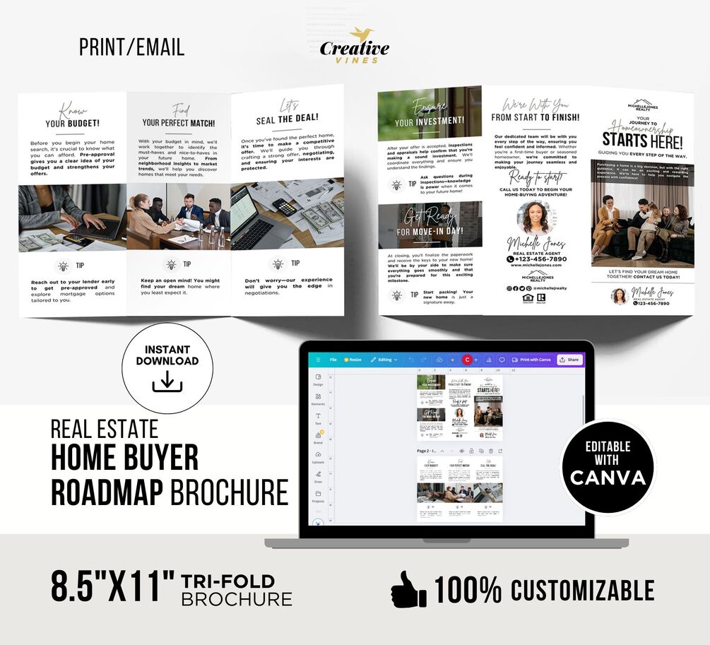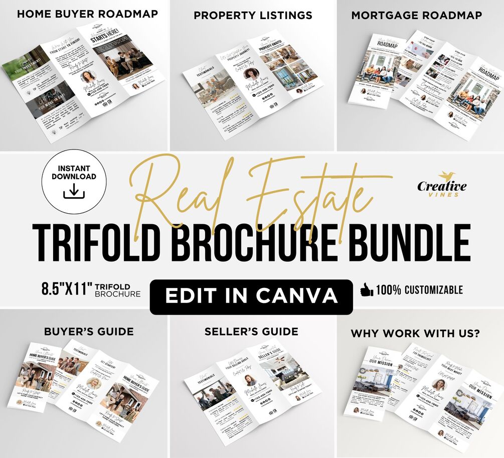 *Every image and graphic is accessible in Canva's FREE version. Your "Real Estate Brochure Bundle (Buyer guide brochure, Seller Guide Brochure, Mortgage Roadmap Brochure, Home buyer roadmap Testimonials Brochure, Why work with Us Brochure) US Letter Size Half Fold Brochures" will be available to use after the profile images, content details, photos and logos have been changed.