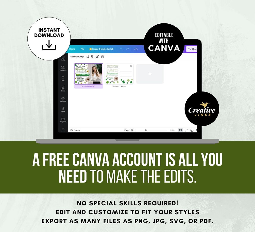 Editable in Canva = Font size, Text, Font, Positioning, Colors, Photos