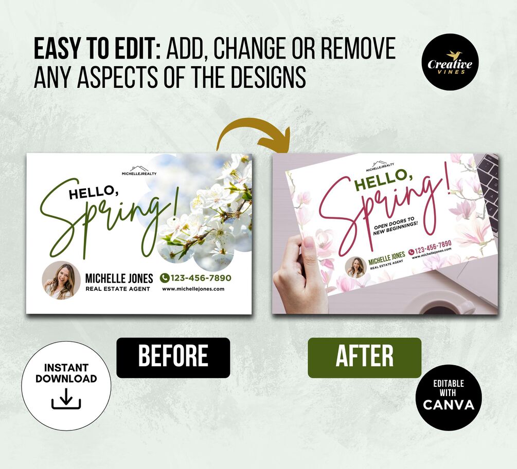 *Every image and graphic is accessible in Canva's FREE version. Your "Real Estate Hello Spring Postcard" will be available to use after the profile images, content details, photos and logos have been changed.