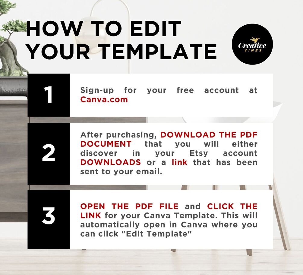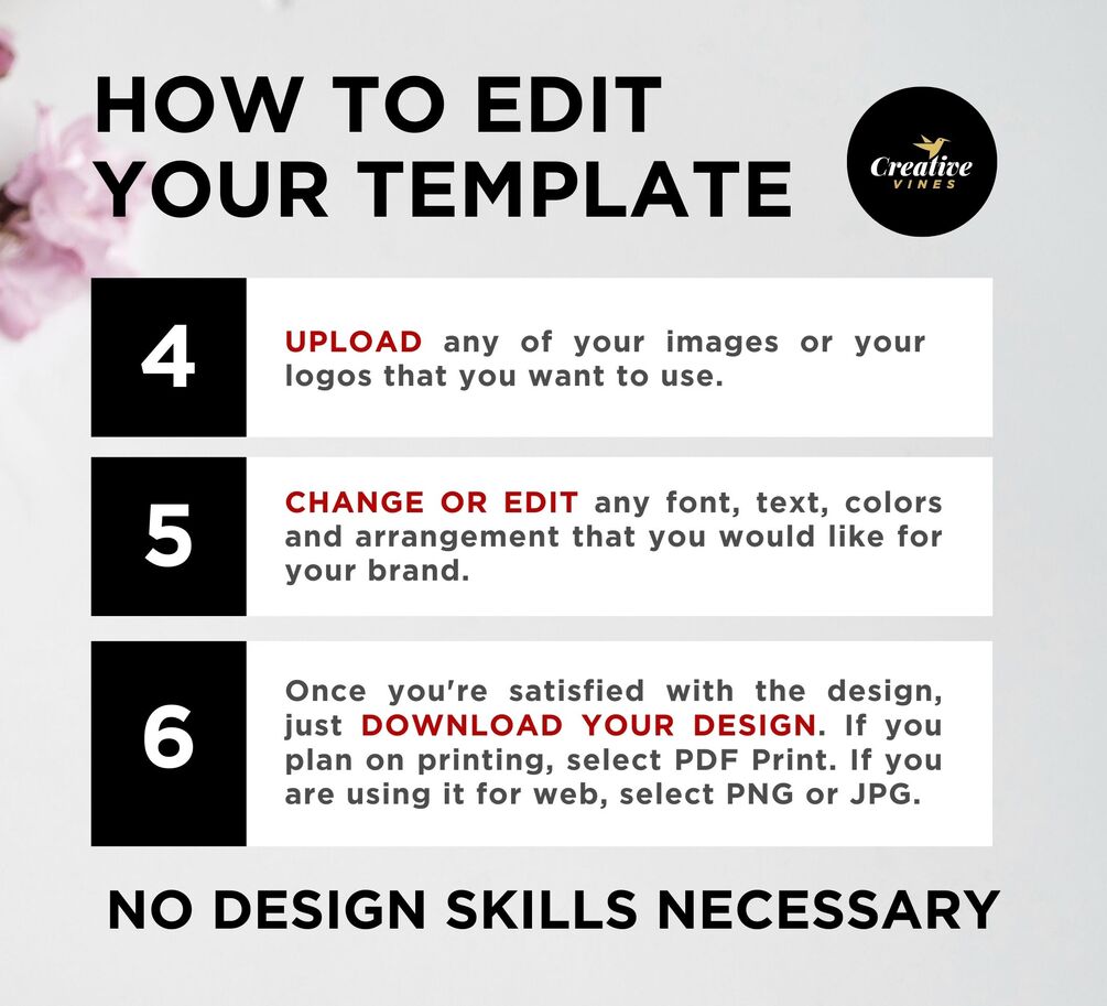 Editable in Canva = Font size, Text, Font, Positioning, Colors, Photos