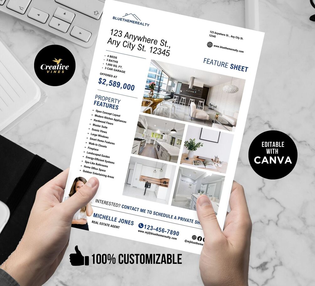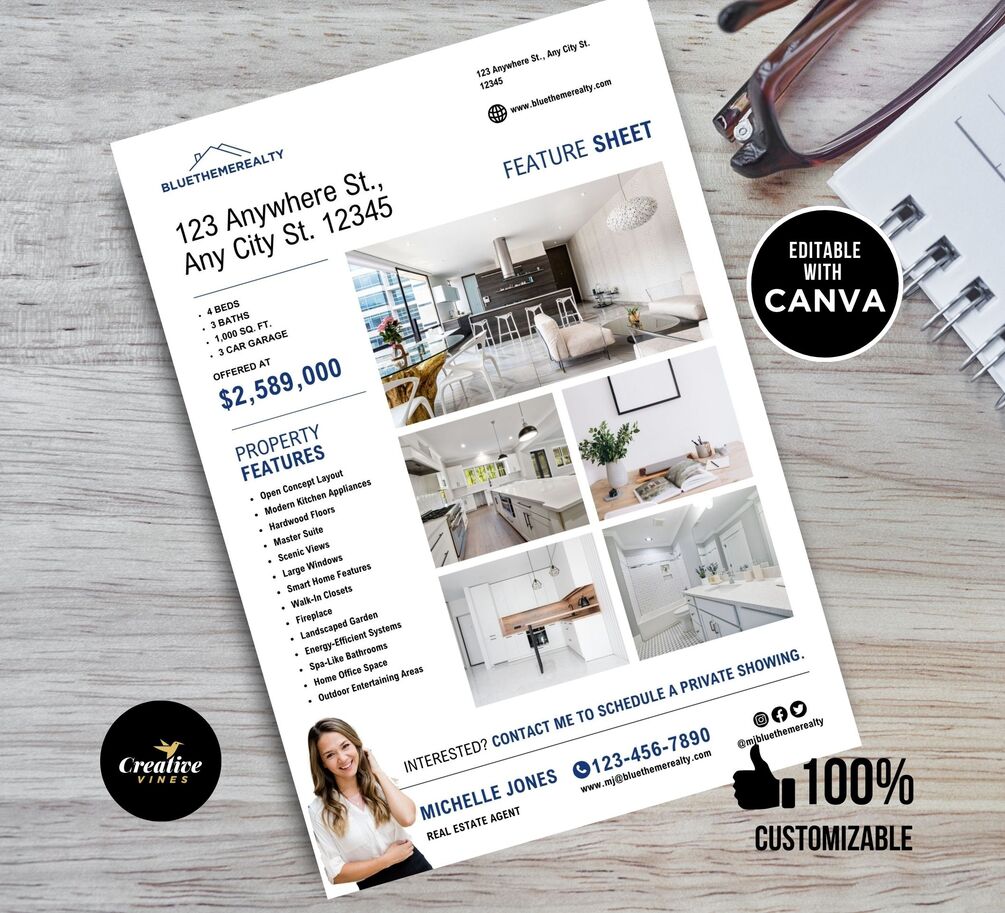 Real Estate Home Feature Sheet, Flyer Template, Real Estate Marketing, For Sale Flyer, Open House Flyer, Real Estate Listing Flyer, Canva