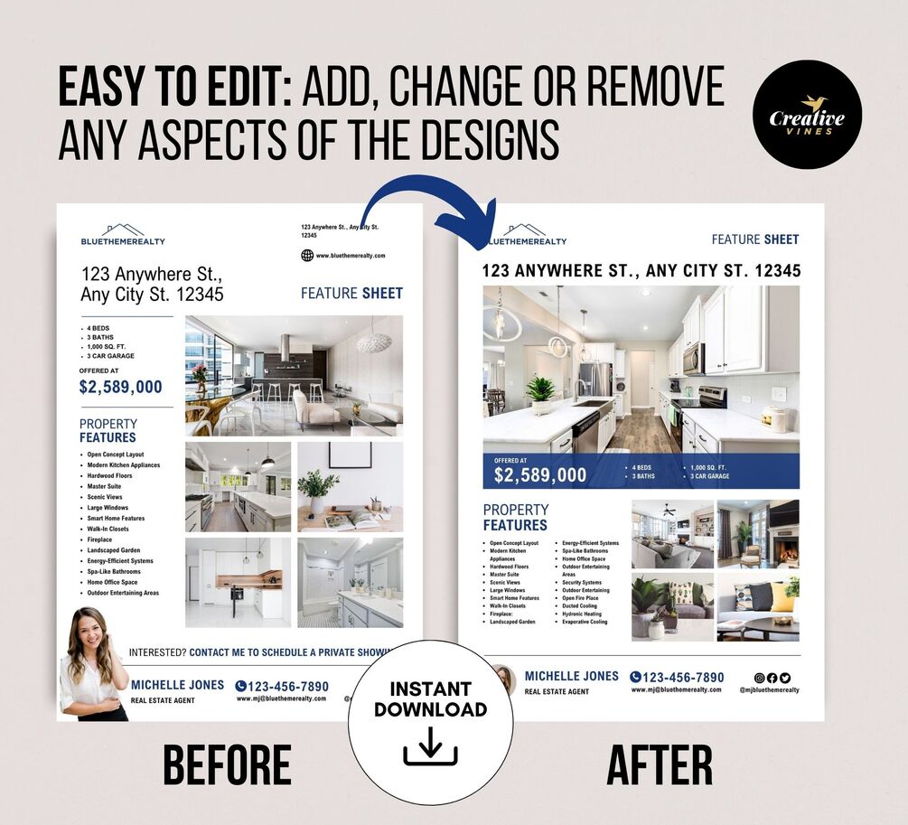 *Every image and graphic is accessible in Canva's FREE version. Your "Blue Theme 4-design Real Estate Home Feature Sheet Bundle A4 Size" will be available to use after the profile images and logos have been changed.