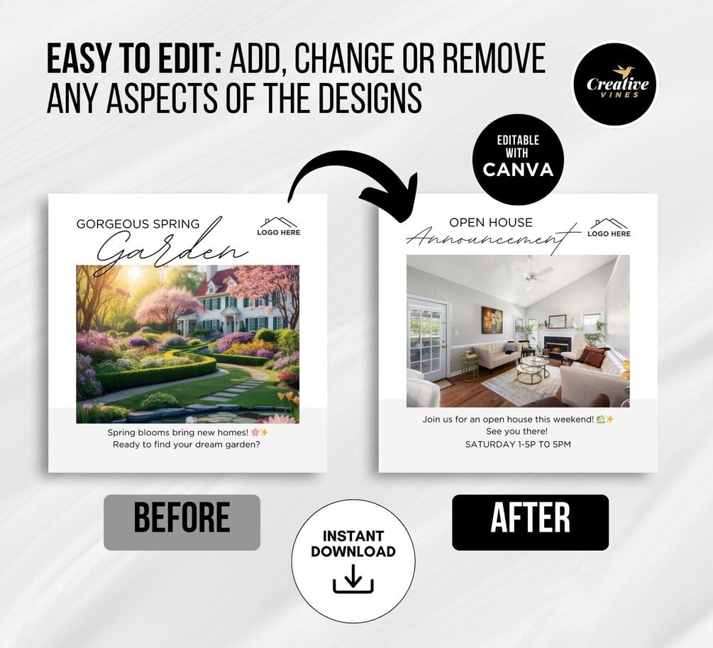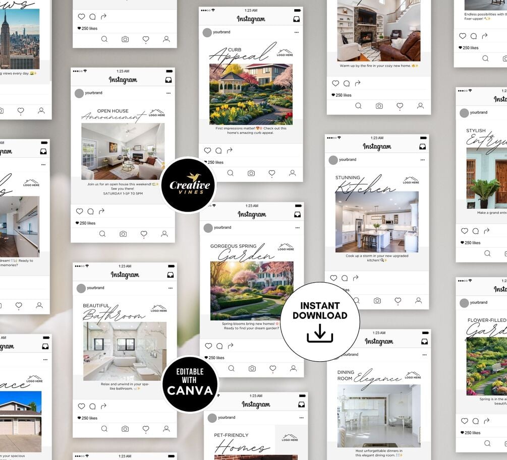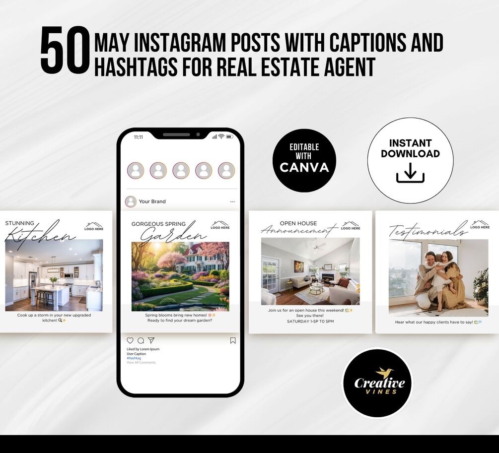 Transform your social media presence this spring with our "50 Stylish May Real Estate Agent Social Media Posts" pack. Curated to captivate and convert, each post is a blend of eye-catching visuals and engaging captions designed specifically for real estate agents. The seamless integration of trending hashtags ensures your message resonates, increasing visibility and engagement. Imagine capturing the essence of May's vibrant energy and translating it into posts that speak directly to your audience's needs. Whether you're showcasing a chic urban listing or connecting with clients through market tips, these posts are crafted to highlight your expertise and personality. Elevate your real estate branding effortlessly, and make every impression count with this dynamic social media toolkit.